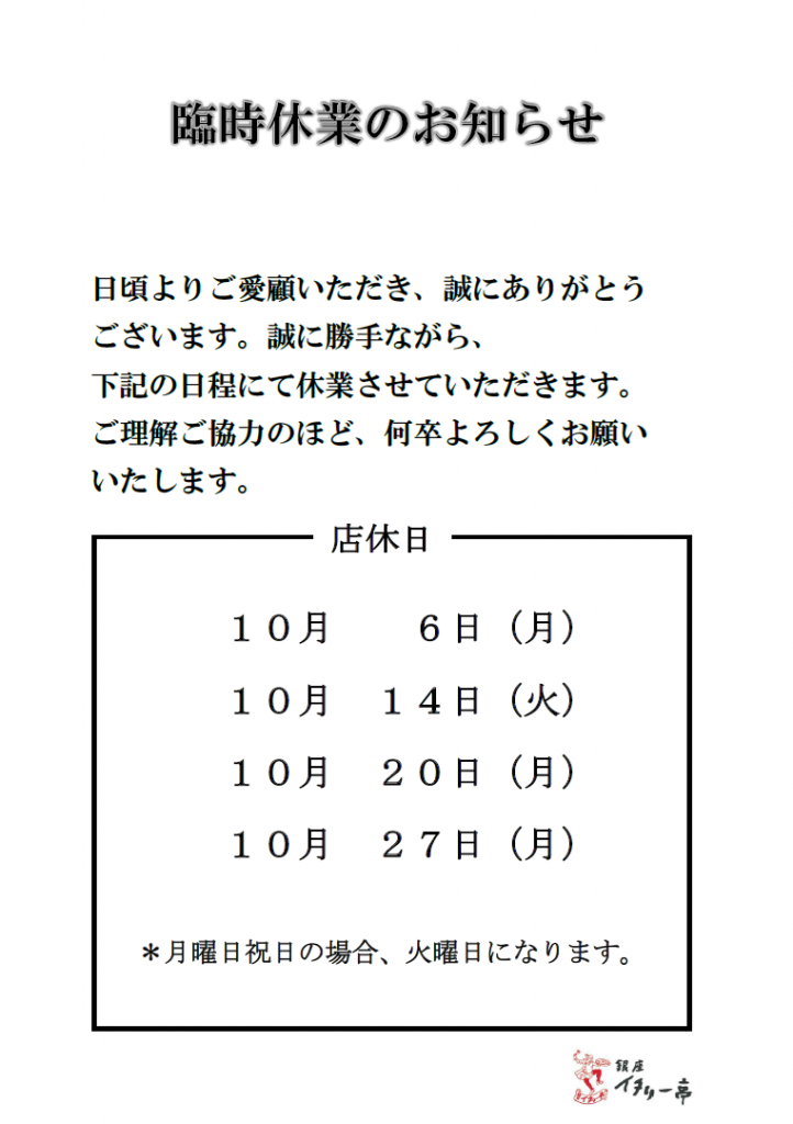 お知らせ 2025-10-06 店休日のご案内👨🍳 投稿ナビゲーション お知らせ イベント フェア・限定セット 料理 スタッフ募集 賞味会 年間スケジュール リポート 銀座イタリー亭寄席 ホールスタッフ募集賞味会年間スケジュール賞味会レポート銀座イタリー亭寄席 2025 (24) 2024 (17) 2023 (20) 2022 (21) 2021 (26) 2020 (25) 2019 (10) 2018 (15) 2017 (6) 2016 (6) 2015 (6) 2014 (6) 2013 (6) 2012 (5) 2011 (6) 2010 (6) 2009 (6) 2008 (5) 2007 (1)